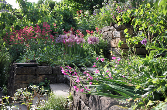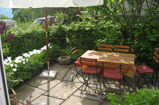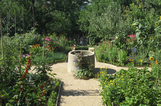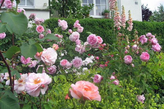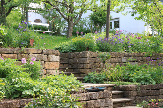 Unser Garten weist den Grundcharakter von 1938 auf: Ziergarten, Streuobstwiese und Gemüsegarten. Ab 1998 haben wir den Garten unter Bewahrung der alten Gliederung neu gestaltet. Im Bereich des Wohnhauses legten wir einen Rosen-und Hortensiengarten an, im Bereich der Streuobstwiese einen Bauerngarten und einen Wildgarten. Die Gestaltung der Trockenmauern mit Angulatensandsteinen erinnert an die frühere Nutzung als Weinberg. Zur Bewahrung unserer örtlichen Flora und Fauna verzichten wir auf chemische Produkte, bewirtschaften den Boden nachhaltig und schaffen Zug um Zug Lebensräume für die unseren Garten besuchenden Tiere. Freiwerdende Bereiche ersetzen wir mit trockenheitsresistenten Pflanzen.