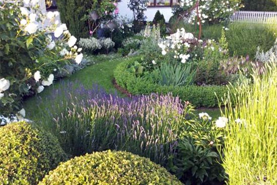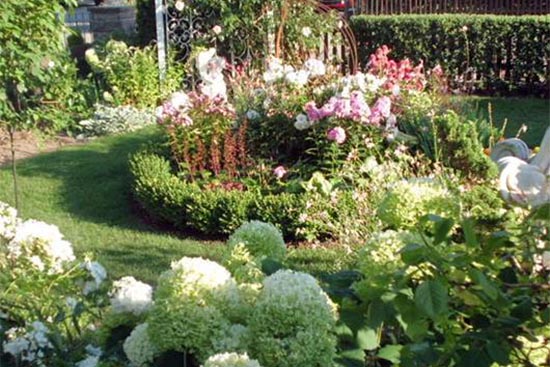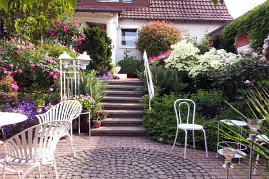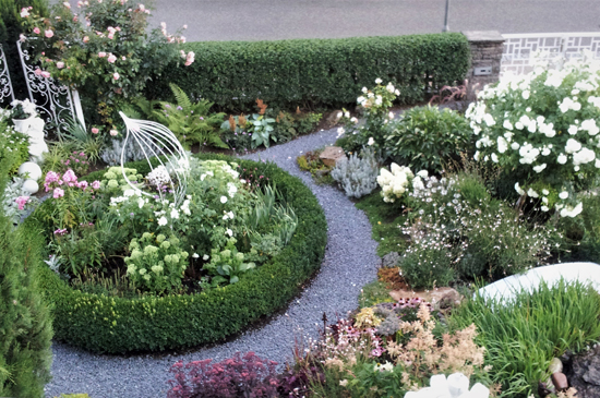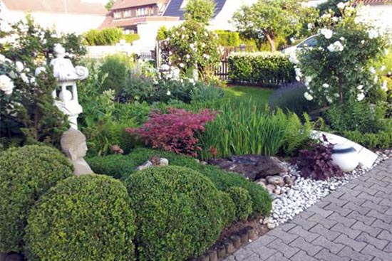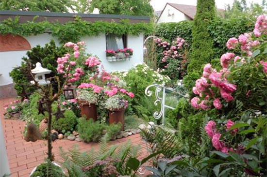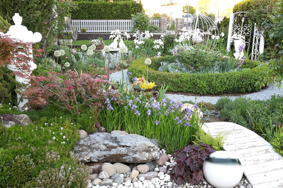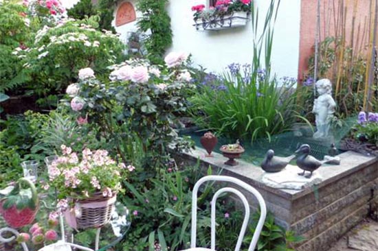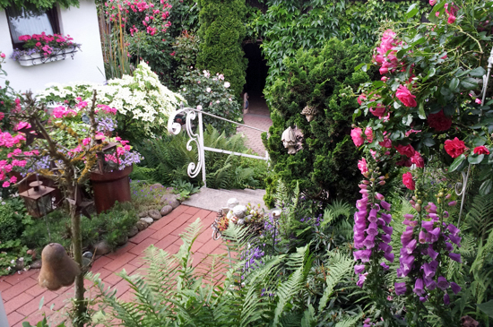 Mit viel Geschick haben die Gartenbesitzer diesen 300 qm großen (kleinen) Garten zu einem optischen Wunder auf engstem Raum herausgeputzt, den sie selbst als „Liebhabergarten“ bezeichnen. Dabei handelt es sich um einen Reihenhausgarten, der mit viel Geschick und Gespür für das Gediegene zu einem Refugium gestaltet wurde, der Gartenliebhabern bestimmt viele Anregungen und Inspirationen mit auf den Weg gibt. Im Vorgarten findet sich ein Buchsrondell in dem verschiedene Stauden und Rosen wachsen. Eisenelemente und ein Springbrunnen ergeben, mit viel Gespür eingefügt in überschwänglich grünende und blühende Pflanzenkombinationen, eine harmonische, wunderschöne Gartenansicht. Im gleichen Stil geht es weiter bis in den hinteren Teil des Gartens. Auch hier überschwänglich blühende und grünende Pflanzen auf 2 Ebenen, darin eingebettet eine Gartenlaube, ein Teich und auch ein Sitzplatz, damit man die ganze Pracht trefflich genießen kann.