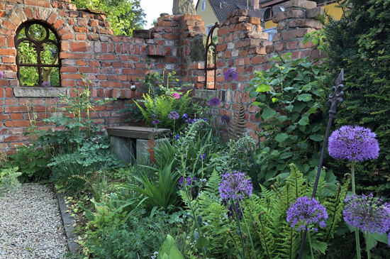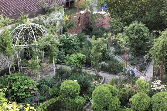 Unter dem Motto, abwechslungsreiches Gärtnern auf kleinstem Raum mit verschiedenen Ebenen gibt es einiges zu entdecken. Der Weg führt an einer Kräuterspirale vorbei an einen kleinen Teich. Dann öffnet sich der Blick auf einen rosenumrankten Pavillon mit frei gestaltetem Kieselmosaik und einen formal angelegter Kräutergarten.